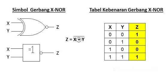 Seperti Gerbang X-NOR, Gerbang X-NOR juga terdiri dari 2 masukan (Input) dan 1 Keluaran (Output). X-NOR adalah singkatan dari Exlusive NOR dan merupakan kombinasi dari gerbang X-OR dan gerbang NOT. Gerbang X-NOR akan menghasilkan Keluaran(Output) Logika 1 jika semua Masukan atau Inputanya bernilai Logika yang sama dan akan menghasilkan Keluaran (Output) Logika 0 Jika semua Masukan atau Input yang bernilai Logika yang berbeda. Hal ini merupakan kebalikan dari Gerbang X-OR (Exclusive OR).